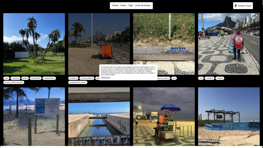 Maria apresentou a página com todas as imagens e micronarrativas presentes no WordPress, as fotos são dispostas em grid com todas as tags e micronarrativas no hover. Esse compilado de registros facilitará a revisão de tags agora que todas as micronarrativas foram escritas.